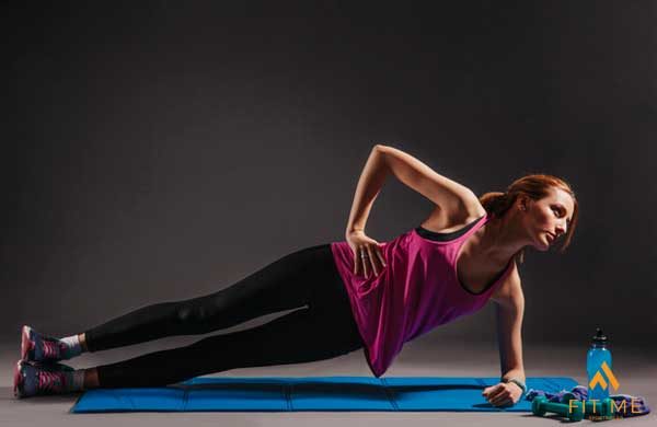 นอนตะแคงด้านขวา ให้เท้าซ้ายทับอยู่บนเท้าขวา วางศอกด้านขวาให้ศอกอยู่แนวเดียวกับหัวไหล่ โดยให้แขนท่อนล่างวางราบกับพื้น มือชี้ไปด้านหน้า ส่วนแขนด้านซ้ายวางแนบกับสะโพกหรือเท้าเอวไว้ จากนั้นออกแรงยกตัวขึ้น เกร็งหน้าท้องและยกลำตัวขึ้น พยายามให้ตัวเป็นเส้นตรง ลำตัวและสะโพกไม่ตก ค้างไว้ 10-20 วินาที พัก 10 วินาที จากนั้นทำซ้ำ 3-5 เซต และสลับข้าง
