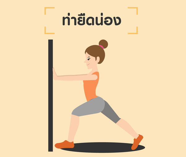 ยืนหันหน้าเข้าผนัง ใช้แขนดันผนัง ก้าวขาเข้าหาผนังหนึ่งข้าง พร้อมงอเข่า และเหยียดขาด้านที่ต้องการยืดไปด้านหลังให้ตึงและออกแรงดันผนังไว้ เพื่อยืดกล้ามเนื้อน่อง ทำค้างไว้และสลับข้าง